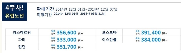 왕복항공권은 최저 파리행 33만 3000원, 암스테르담 35만 6600원, 모스크바 39만 1400원, 런던 35만 1700원으로 파격적인 가격이다. 여행기간은 12월 1일부터 2015년 3월 31일까지다. 이 프로모션 행사는 12월 1일부터 7일까지 일주일동안 진행되며 선착순으로 모집한다.