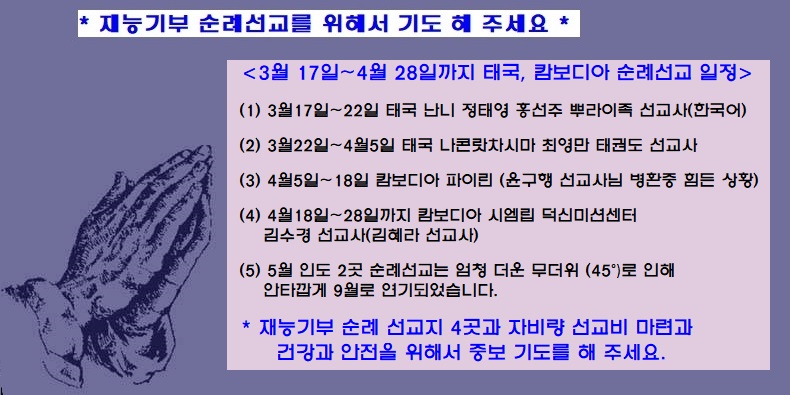 3월~4월 태국 캄보디아 순례선교 위해 기도해 주세요.